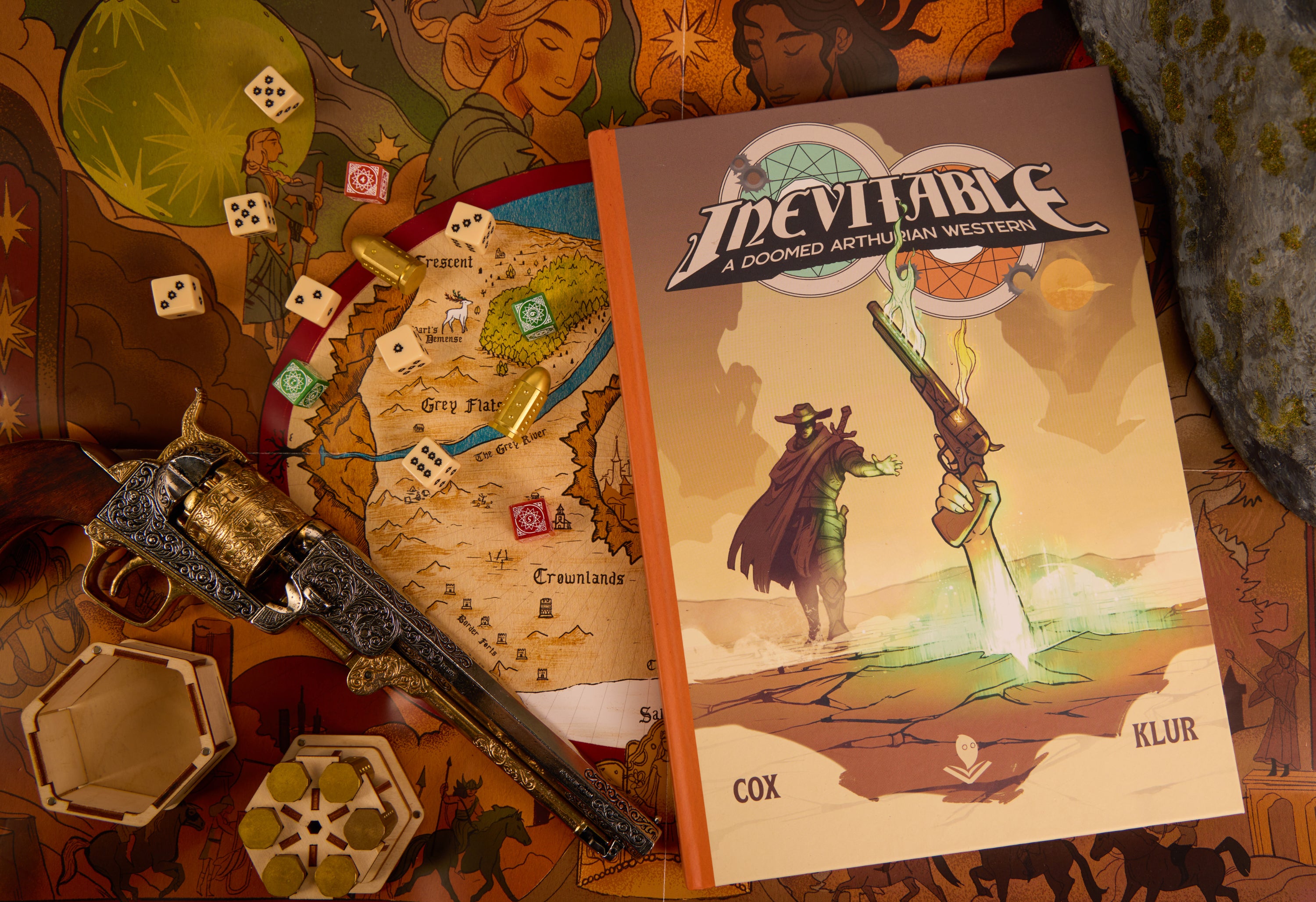 Inevitable is a Arthurian Western roleplaying game for 2-6 players and a GM, where your party of disastrously sad cowboy knights fail to stop the apocalypse. This 284 page book contains all the rules, character creation and the setting for your campaign, thoroughly and evocatively detailing The Barren, the lands surrounding the Kingdom of Myth.