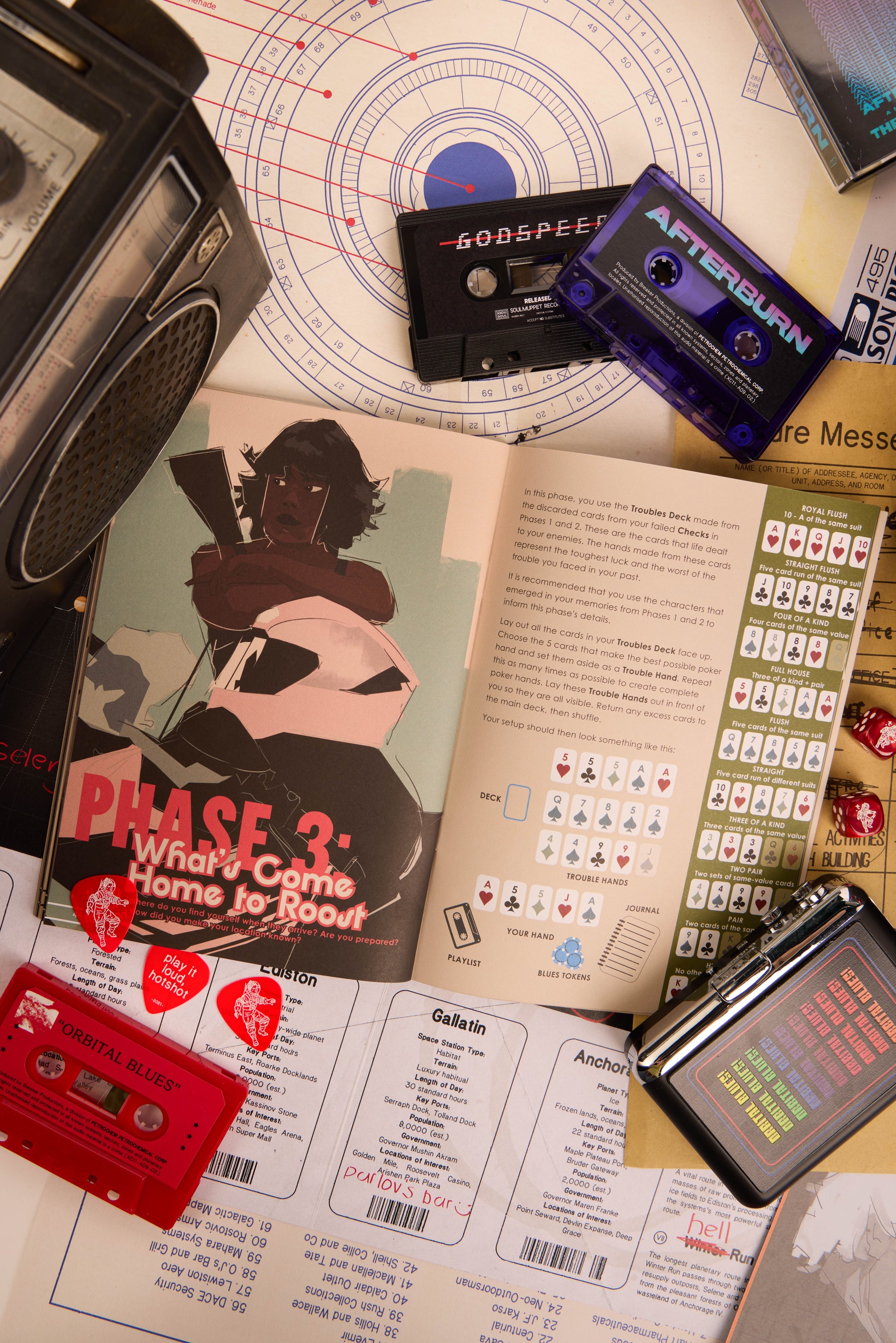 This is a SOLO PLAY supplement for ORBITAL BLUES written by Elliot Davis and references the original text. Using a deck of playing cards and a handful of poker chips, players will reflect on the life of an outlaw and reckon with their Trouble as they attempt to build the best poker hand possible.