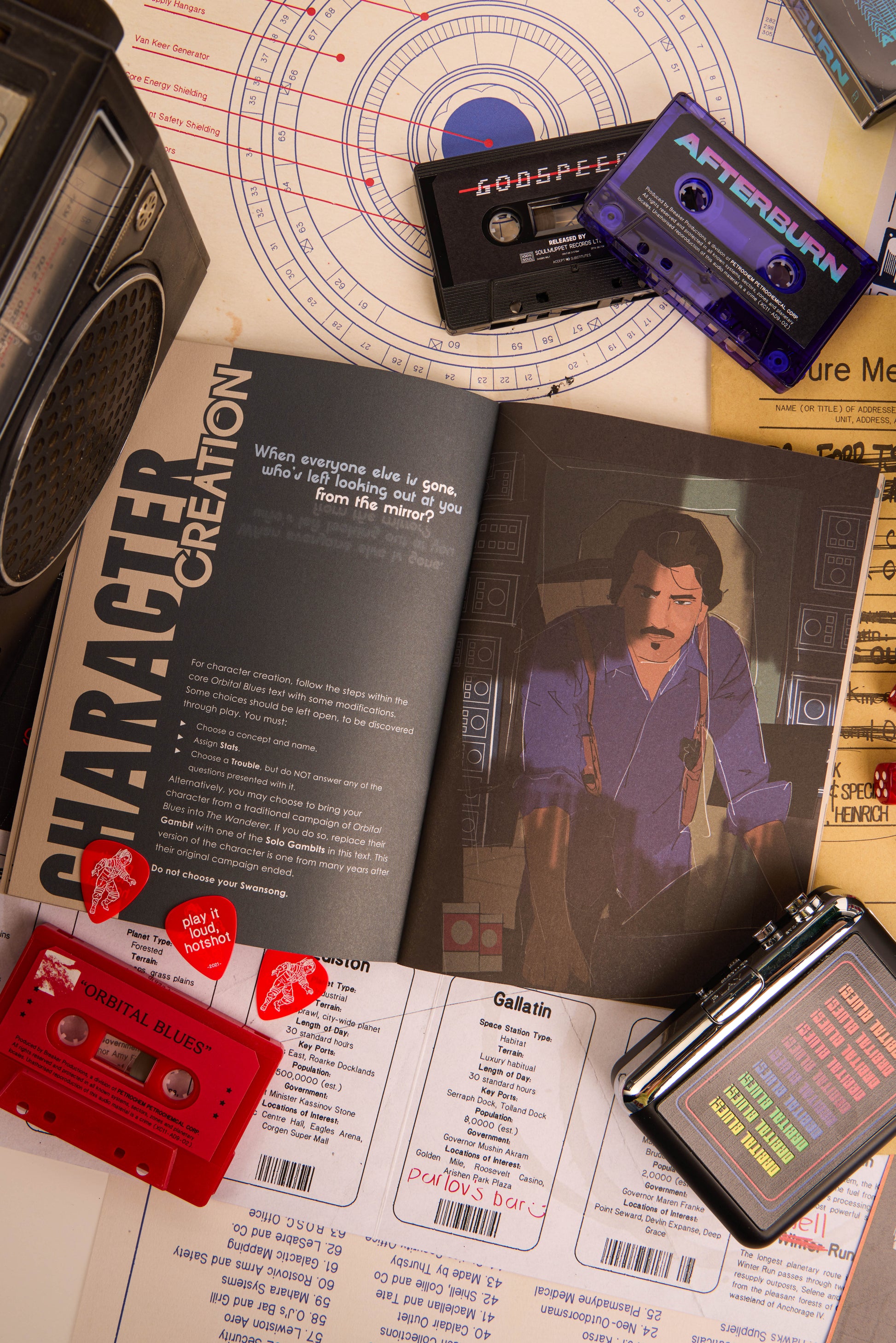 ORBITAL BLUES is a lo-fi space western roleplaying game from SoulMuppet Publishing, written by Sam Sleney & Zachary Cox and illustrated by Josh Clark. A roleplaying love-letter to off-beat sci-fi, vintage music, and cooperative old-school styled roleplay, Orbital Blues allows you to play out rules-light adventures in the style of your favourite space westerns.